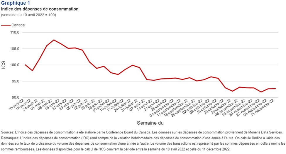 Durant le quatrième trimestre de 2022, la croissance des dépenses de consommation a ralenti. L’indice des dépenses de consommation (IDC) avait atteint une moyenne de 95,6 points en octobre, pour descendre à 92,7 points en novembre et à 92,4 points en décembre.