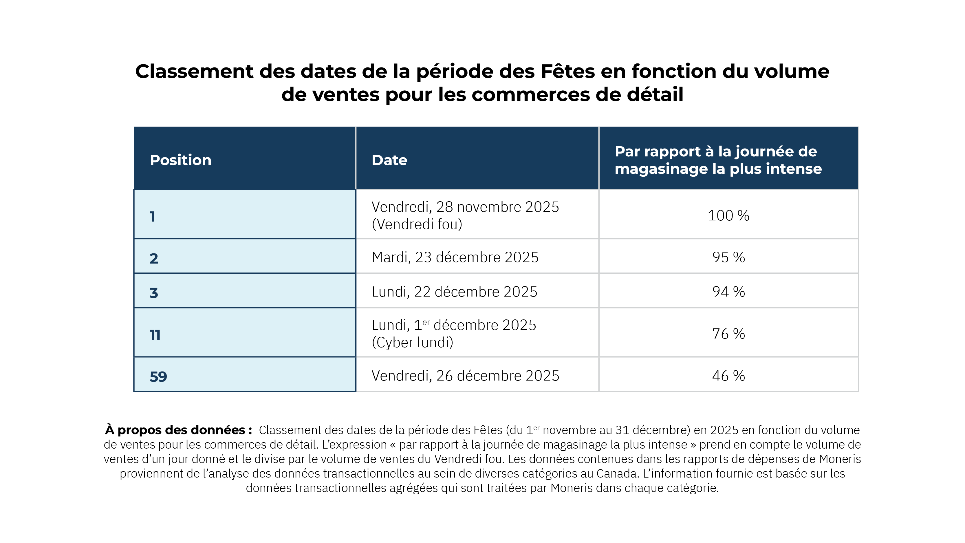 Les données de Moneris illustrent comment les Canadiennes et Canadiens ont fait leurs achats pendant les Fêtes. Découvrez quand les pics de dépenses ont eu lieu, où l’activité a augmenté et comment les habitudes d’achat ont évolué. Utilisez ces informations pour planifier votre prochain guide des Fêtes.