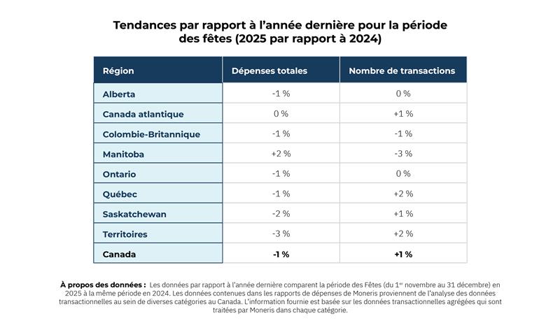 Les dépenses durant les Fêtes au pays sont restées relativement stables en 2025, avec une baisse d’un peu moins de 1 % par rapport à l’année dernière. Le nombre de transactions a légèrement augmenté, les consommatrices et consommateurs ont fait davantage d’achats, mais avec un montant moyen des factures moins élevé. L’inflation, la montée des coûts de la vie et une confiance fluctuante ont mis les budgets sous pression.