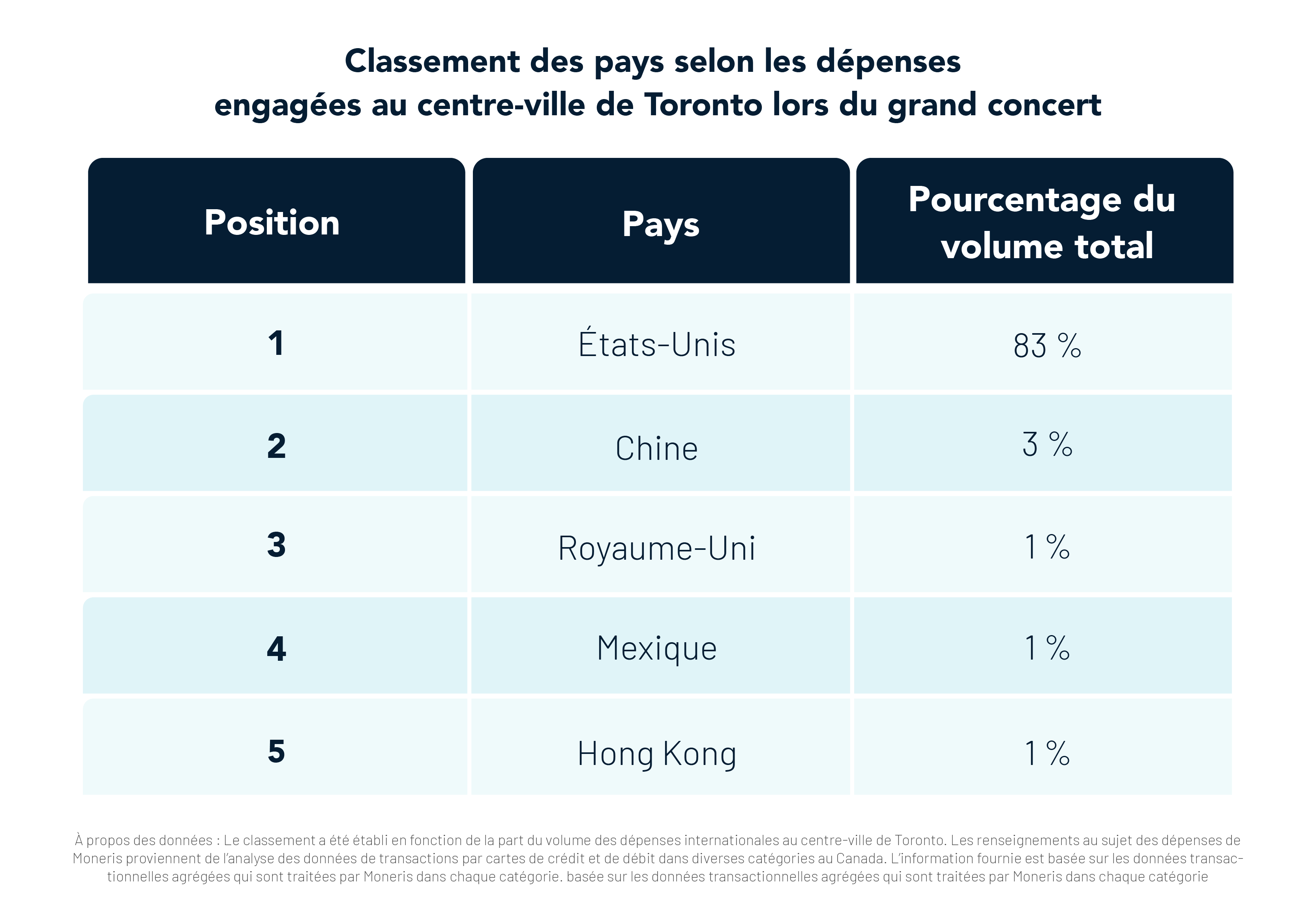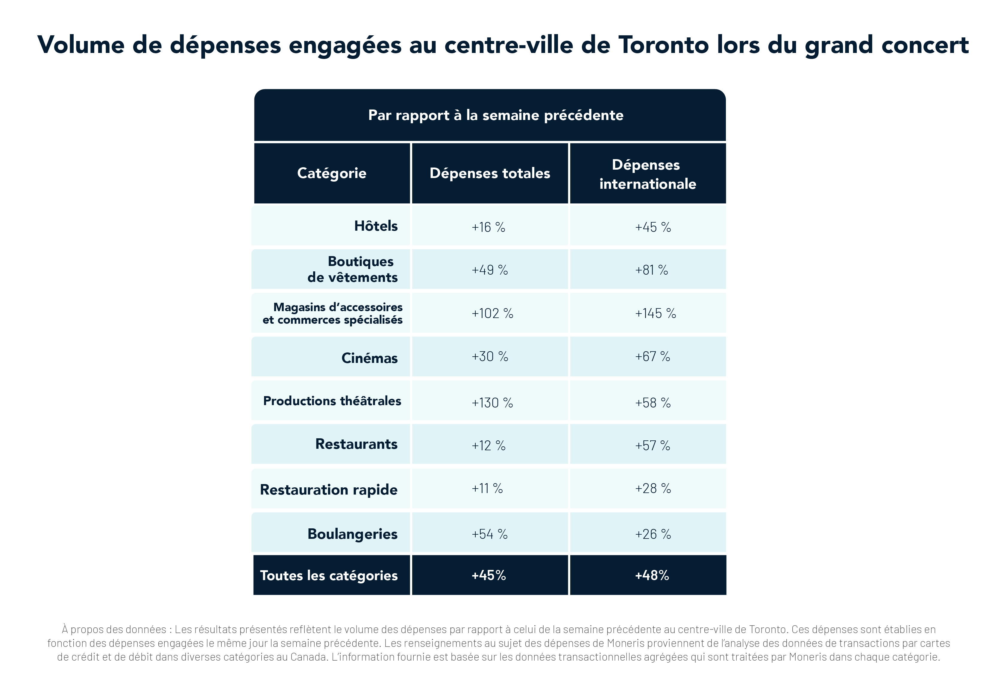À propos des données : Les résultats présentés reflètent le volume des dépenses par rapport à celui de la semaine précédente au centre-ville de Toronto. Ces dépenses sont établies en fonction des dépenses engagées le même jour la semaine précédente. Les renseignements au sujet des dépenses de Moneris proviennent de l’analyse des données de transactions par cartes de crédit et de débit dans diverses catégories au Canada. L’information fournie est basée sur les données transactionnelles agrégées qui sont traitées par Moneris dans chaque catégorie.